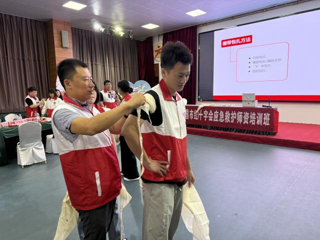 为确保技能真正落地,讲师团队全程“手把手”指导,借助模拟人开展高频次实操训练:每当参训人员出现动作偏差(如绷带缠绕松紧度不当),讲师会立即叫停并现场纠正,用“具象化教学法”破解难点。例如在创伤包扎练习中,讲师提出“一指原则”—以“能伸入一指”为标准判断绷带松紧度,既保证止血效果,又避免影响血液循环。这种通俗易记的判断方法,让参训人员瞬间突破瓶颈。